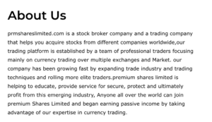 The domain prmshareslimited.com is relatively new and appears to have been active for less than a year. While the company name is listed as Premium Shares Limited, no credible proof of legal registration or regulatory licensing exists in trusted financial or corporate records.